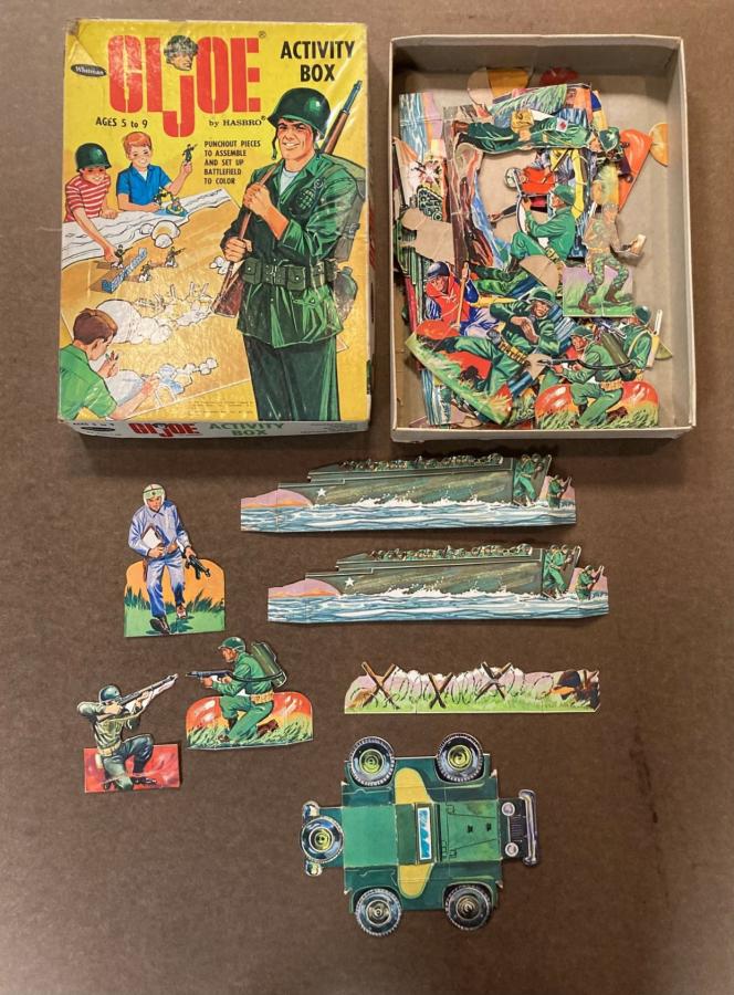 Whitman GI Joe Activity Box from the 1960's. Includes a large paper play mat that can be colored (this one has already been colored by a previous owner) plus a large number of cardboard stand-up figures yo can use to depict battlefield scenes. The box measures 12 inches by 9 inches by 1.5 inches. Asking $35 shipped in the USA.