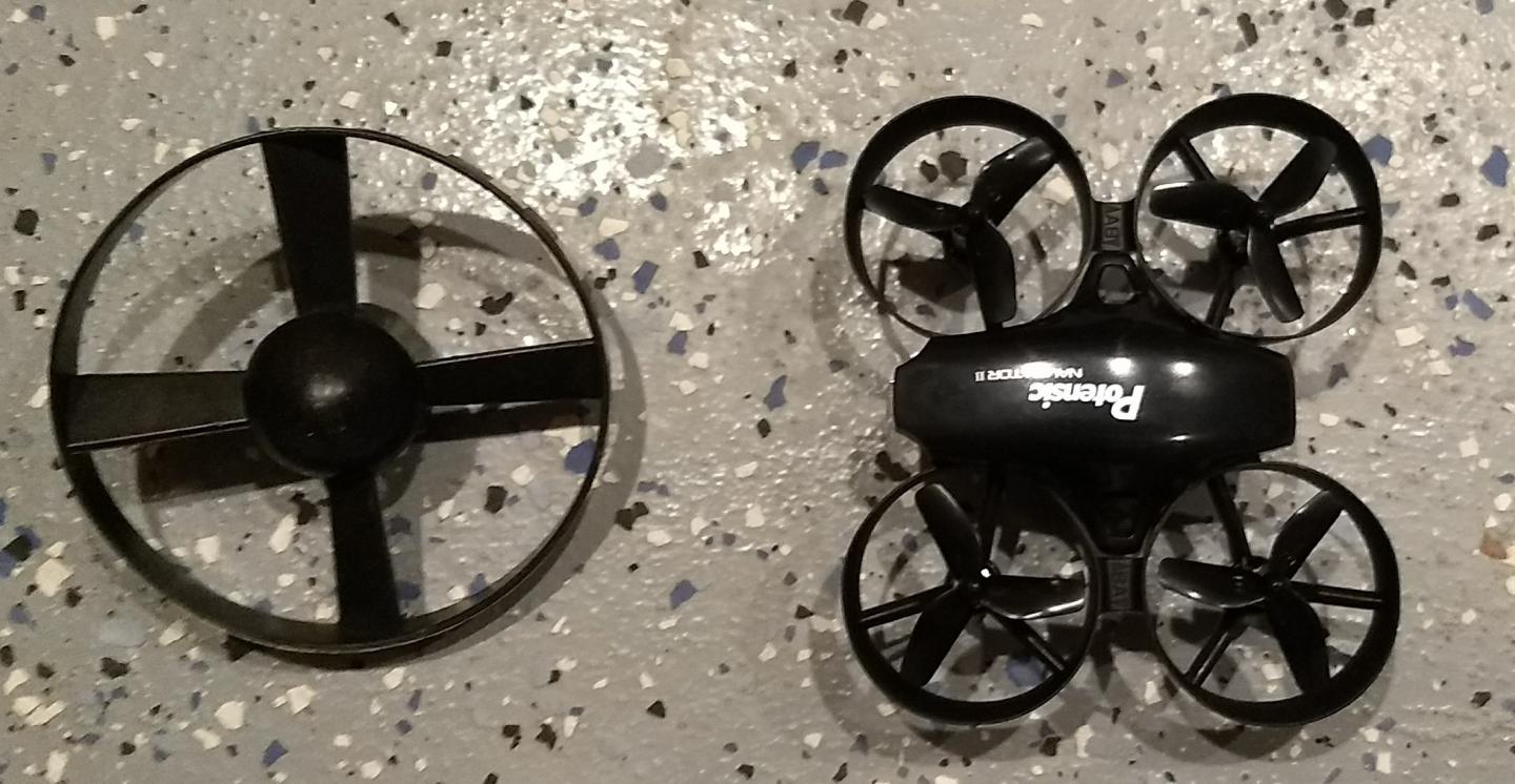 Since the drone actually HAS a camera (live video to your cell phone in addition to recording video and stills), there's no need for the round spinny thing, except for nostalgia. It'll automatically take off, land, and hover, too. Pretty groovy. Cheap, too -- I think it was around $45.