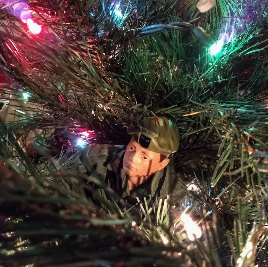 Joe is on duty Christmas Eve. Equipped with radio and binoculars, he's in position (cleverly camouflaged in the branches of the tree), to send Xmas morning reports to the HCC (Holiday Command Center) down in the basement Joe Room.