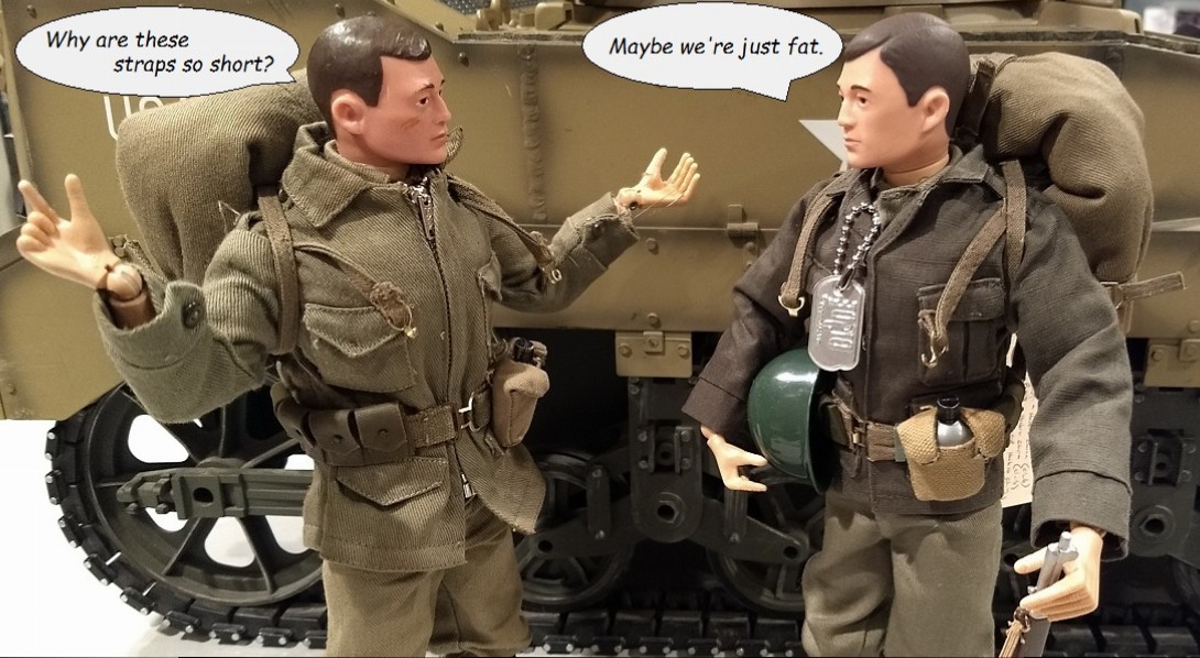 I think if I added the poncho where it belonged, the shoulder straps would be too short to get Joe's arms into! But those little straps that are supposed to hook to his ammo belt? How useless! I confess I DO have a couple of packs that look ok with 'em hooked to the belt... but they're exceptions, not the rule. Here, Vintage Joe and Club Talker can't figure it out, either. We need a "hints and tips on loading Joe's Field Pack" thread! Hey... this is it!!! Add your tips and ideas here!!!